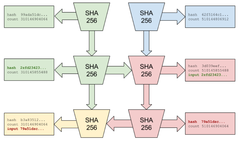 “随机初始值”输入到 sha256 函数,得到输出hash1。 - 第二步计算:将