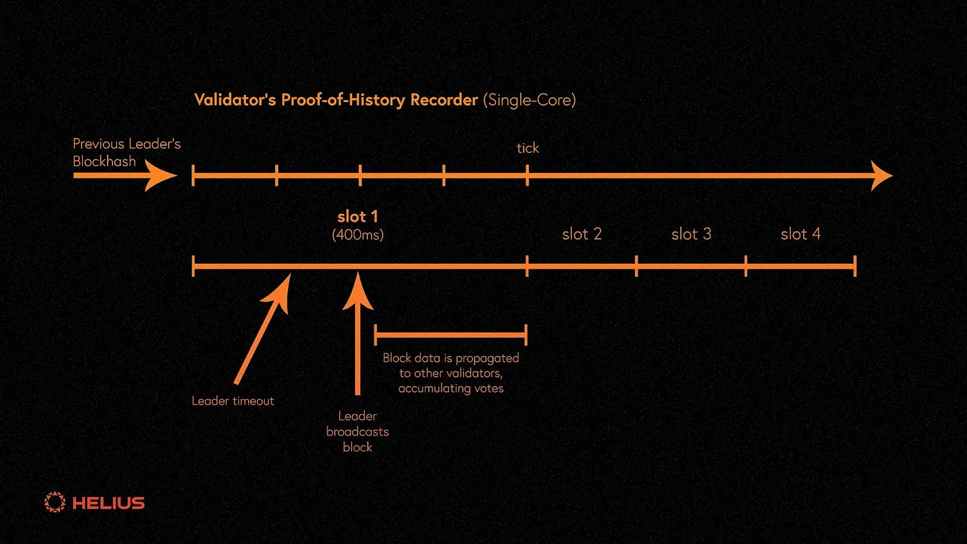为了避免 Leader 节点处产生单点故障,因此引入了时间限制。在 Solana 中时间单位是以 epoch 进行划分,每个 epoch 包含432,000 个 slot(时隙),每个 slot 持续 400ms,在每一个 slot 中,轮换系统会在每个 slot 内分配一个 Leader 节点,Leader 节点必须在给定的 slot 时间内发布区块(400ms),否则,就会跳过这个 slot,重新选举下一个 slot 的 Leader 节点。