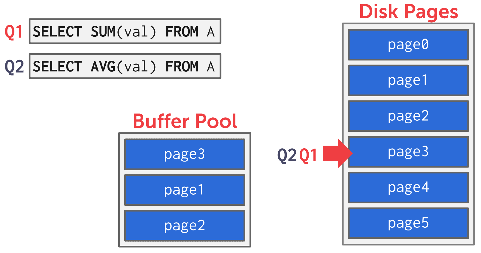 如下图中,Q1 和 Q2 都会访问 Page 0,DBMS 可以识别将其标识为重要的页面,使其那么不易淘汰出去。