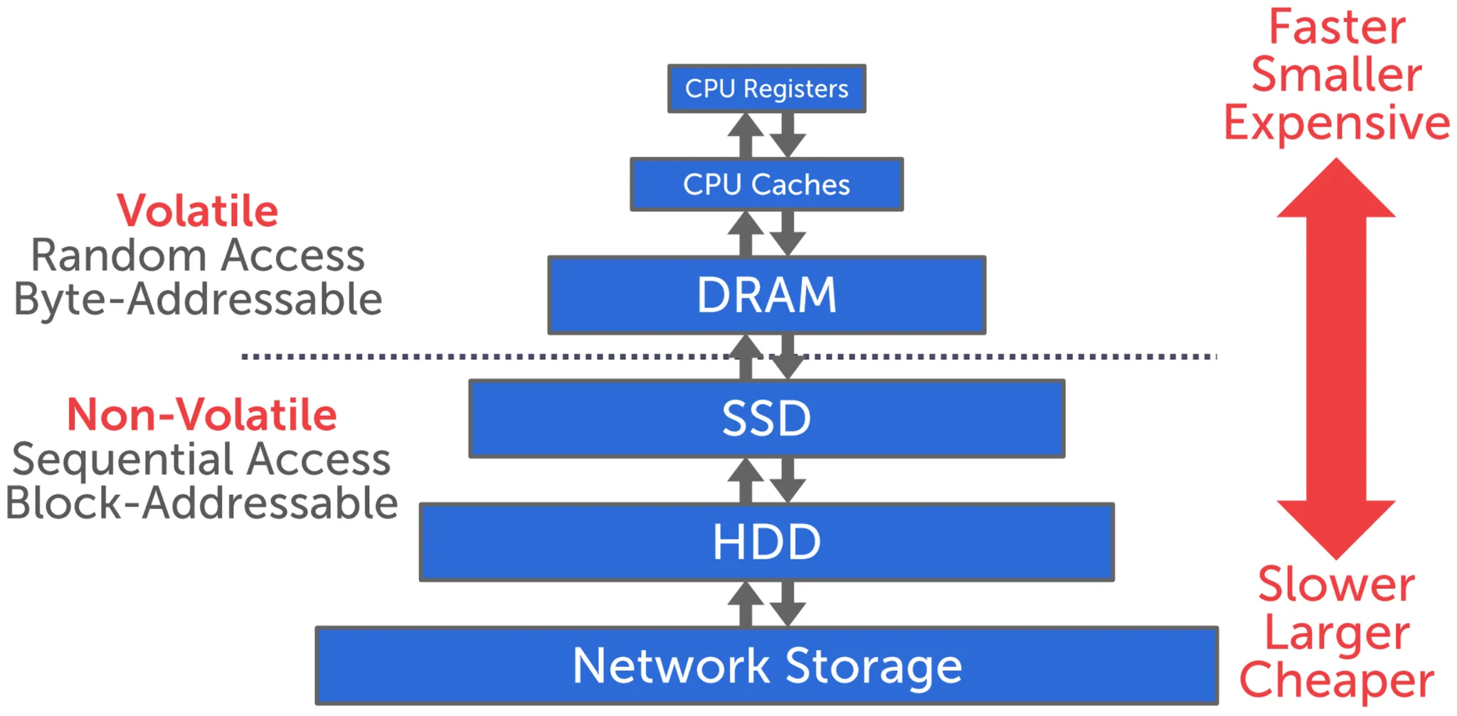 下图中是计算机存储层次架构图,越往上的存储介质,速度越快,空间更少。反之,越往下的越慢,但有更廉价的存储。不过还是主要分为两类:易失(Volatile)和非易失(Non-Volatile)