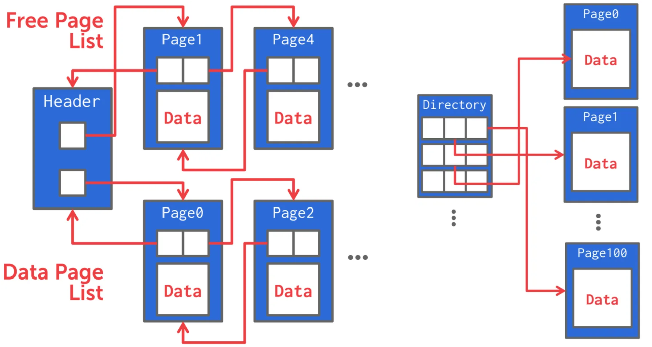 当然可以不以 Page 目录的形式,也可以以 Page 空闲链表的形式:DBMS 在文件开头维护一个 header 页,储存两个指针:指向第一个空闲页、指向第一个数据页。