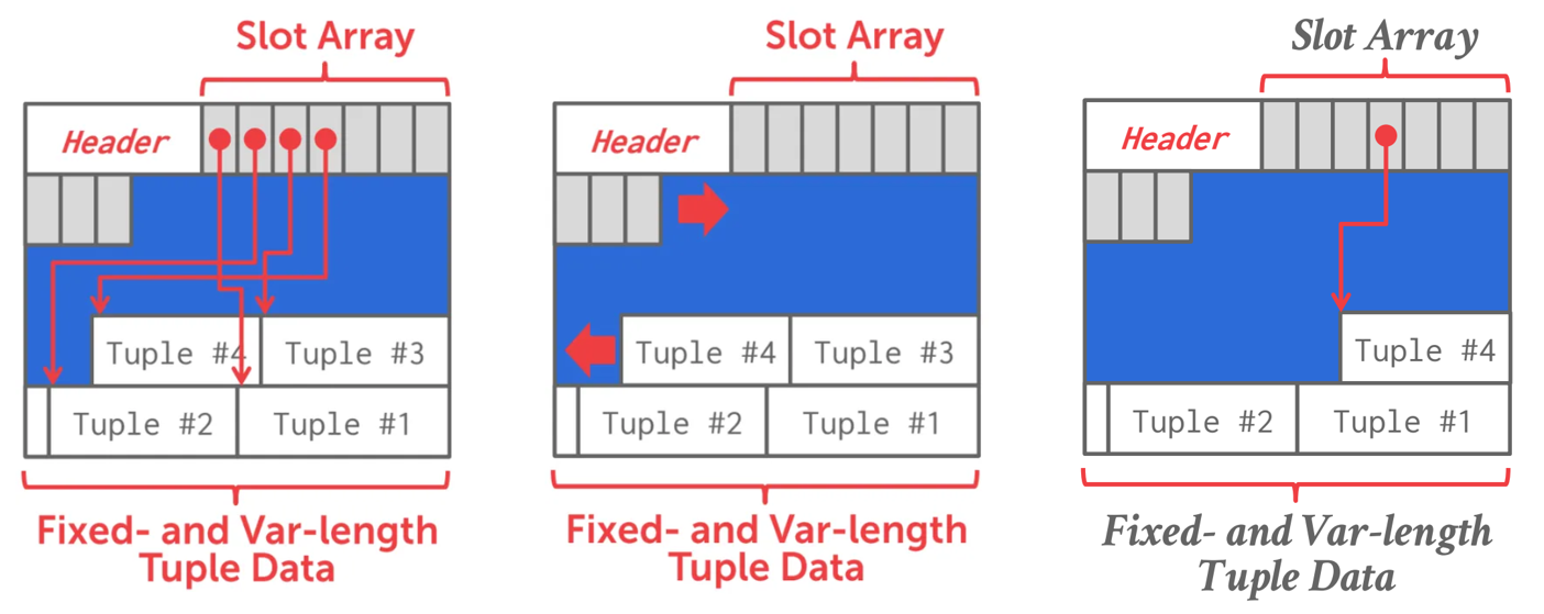 - Slot Array 储存每一个 Tuple 的起始 offset。Header 还会记录已经使用的 Slot 和最后一个使用的 Slot,便于查询和写入