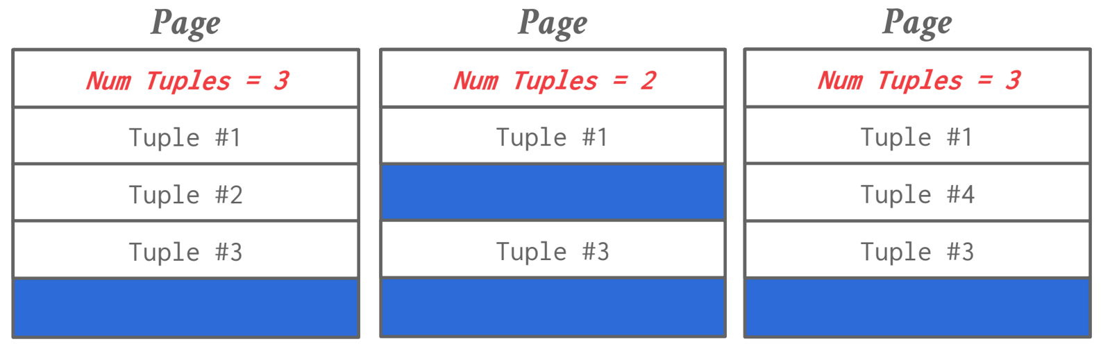 最简单的方式!在 Page 头部记录有多少个 Tuple,有新 Tuple 时直接插入到 Page 末尾即可。但这会出现其他问题: