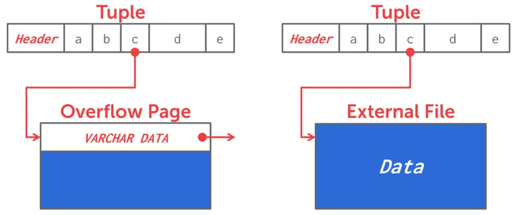 大多数 DBMS 不允许 Tuple 超过单个 Page 的大小。如果 DBMS 储存的值超过了 Page 大小,DBMS 会使用额外的页(Overflow Page)。不同数据库对溢出的定义也不同: