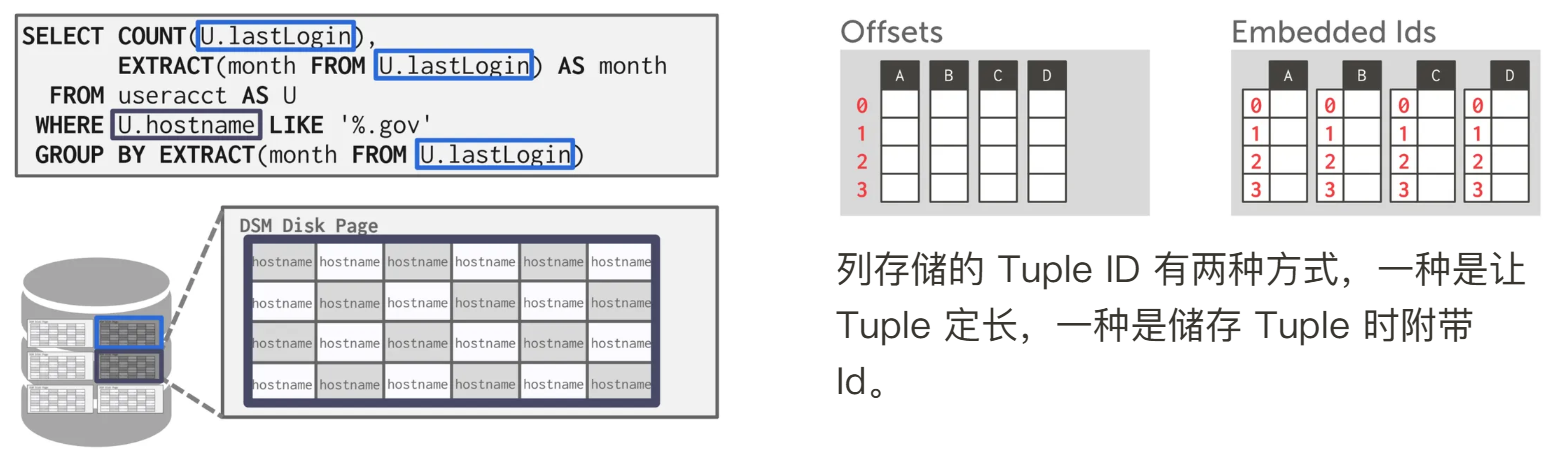 DBMS 将所有 tuple 的单个属性的值储存在了一个 page 里,一般用于 OLAP,也称为列存储。