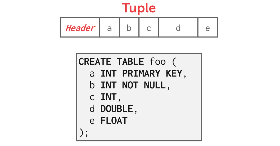 Tuple 本质上是一个字节数组,DBMS 的工作是将这些字节译为属性类型和值。对于关系数据库,属性通常按照创建表时指定的顺序存储。然而,以不同的方式排列它们可能更有效。